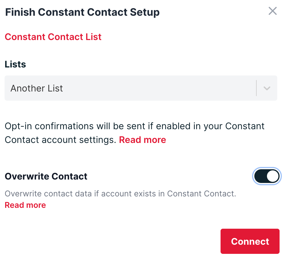 Formspree will use the email address to create a new Constant Contact contact. If a contact already exists with the provided email address, no changes will be made to the existing contact in Constant Contact, and the submission tab will indicate its existence. However, if the “Overwrite contacts” option is enabled during plugin setup, all provided fields will be updated in Constant Contact.