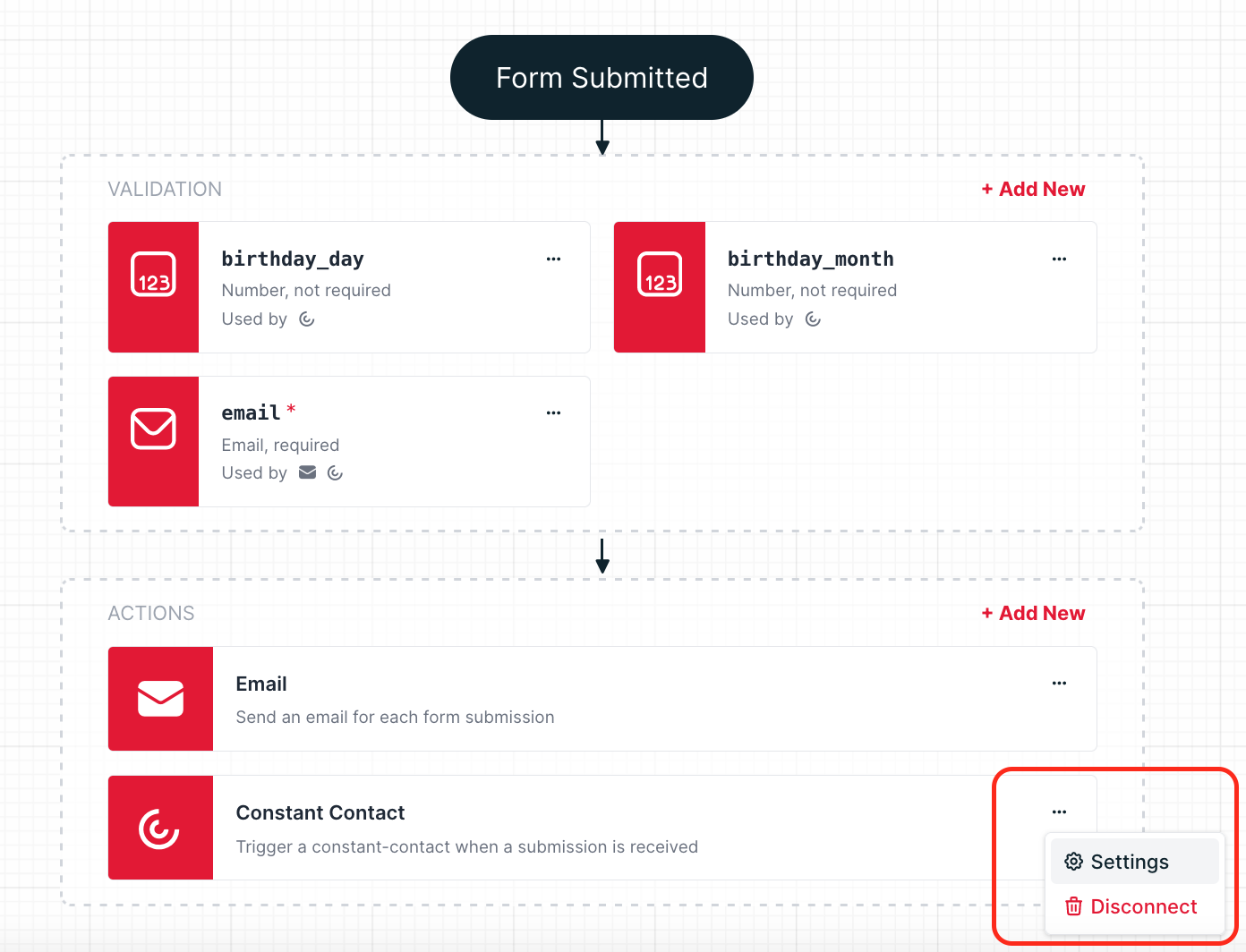 If the user wants to change the settings of the plugin, the user can get to the workflow tab in Formspree interface, locate the constant contact plugin and click on the three doted button as show in the red square in the image below and then click of the settings button