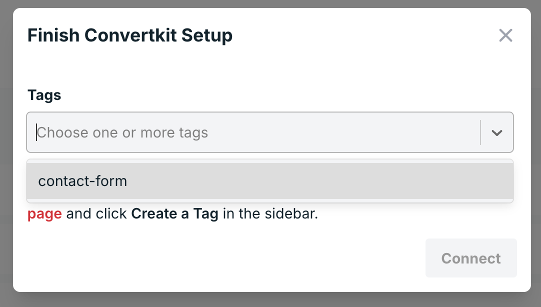 Las etiquetas que añadas allí aparecerán en la ventana emergente de la integración con Convertkit en el panel de Formspree: