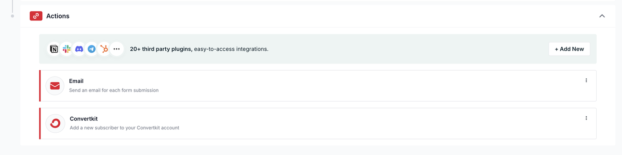 Una vez hecho esto, verás Convertkit añadido en la sección Actions de la pestaña workflow de tu formulario: