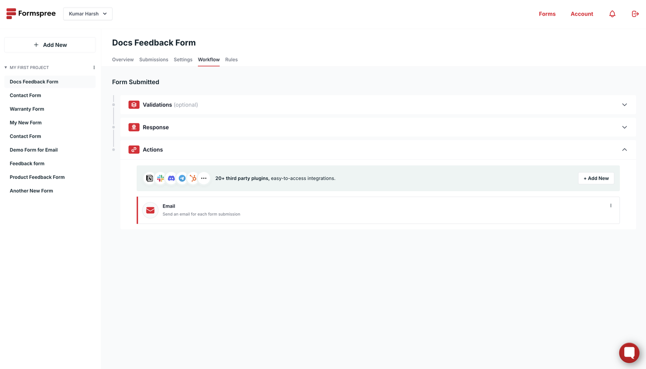 Una vez que hayas creado y configurado un formulario, puedes conectarte a Convertkit usando el plugin de Convertkit. Para hacerlo, primero ve a la pestaña Workflows de tu formulario. Luego, haz clic en el botón + Add New: