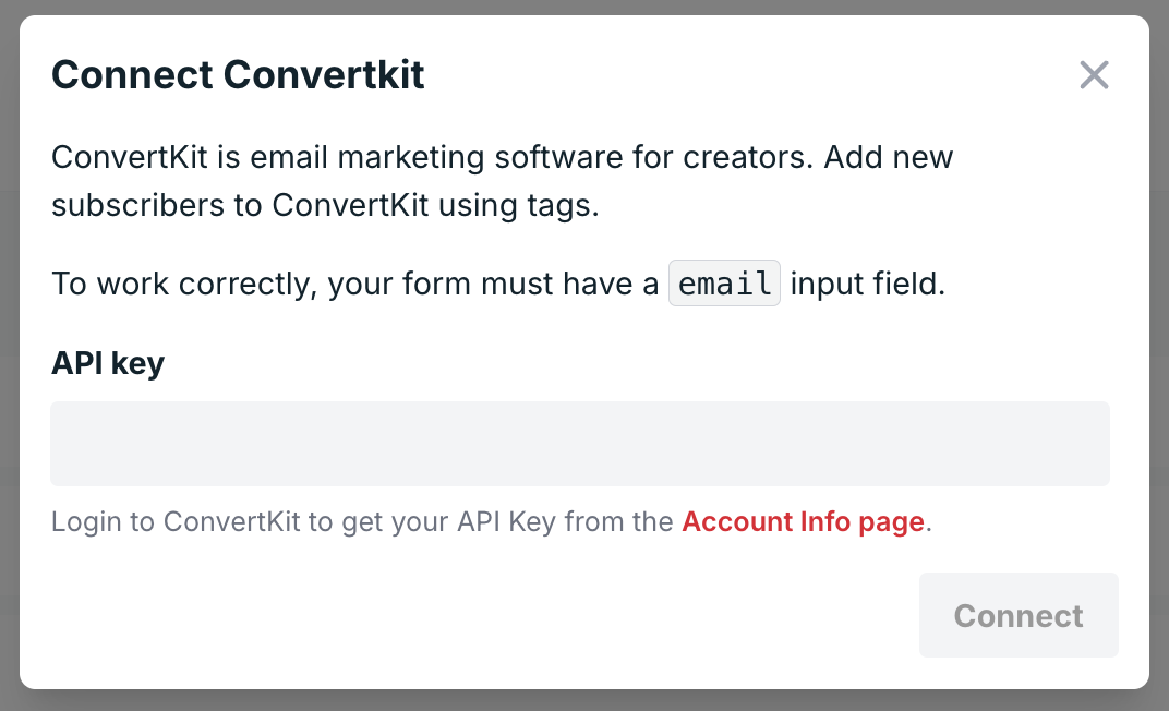 Nota: Si estás usando la Formspree CLI, consulta nuestro artículo Add subscribers to Convertkit para conectarte a Convertkit.