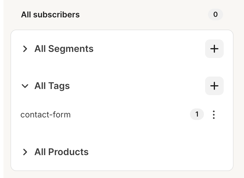 Después, deberás elegir la etiqueta que se asignará a los suscriptores creados mediante esta integración. Si no tienes una, deberás crearla yendo a tu página de suscriptores de Convertkit y haciendo clic en el icono + junto a All Tags en la sección All subscribers de la barra lateral:
