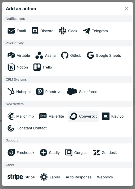 Se abrirá una ventana emergente titulada Add an action. En esta ventana, selecciona el plugin Convertkit dentro de Newsletters:
